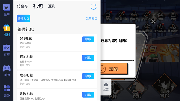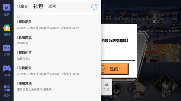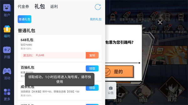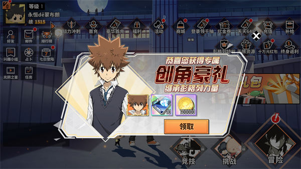1、首次进入游戏内我们就可以领取到创角豪礼。