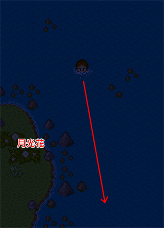 接着要在晚上到本岛海滩(D区),晚上才能取得「月光花」,若是习惯黄昏就就寝恢复体力的玩家,可能在这边就会卡关。海滩上只有一朵月光花,可以在左侧游泳出去,到小岛上,小岛上有5朵月光花。接着对月光花使用「研钵」,1个月光花可得到5个「月光花汁」,至少需要25个月光花汁(5朵月光花)。
