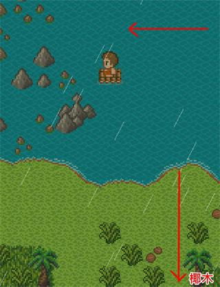这里就是出到主岛外面,划船过去主岛右上角的草堆那边,往右下的地方划去,走过倒下的大椰木,再割草