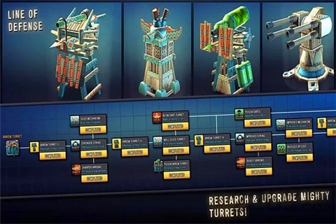 3、12层不同的塔楼为您塔防御,每一个独特的研究树,使之更加强大!用箭塔中的箭刺穿僵尸,用研钵炸弹将它们炸成碎片,或用特斯拉线圈使它们通电。