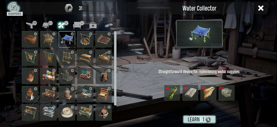 首先,你需要建造一个 Water Collector(集水器)。没有淡水,你就无法生存。