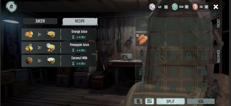 岛上种植了大量的香蕉、橙子和菠萝。你可以收集它们并立即吃掉它们,或者你可以在你家建造一个榨汁机并从中榨出果汁。在榨汁机中,您可以获得橙汁和菠萝汁、椰奶