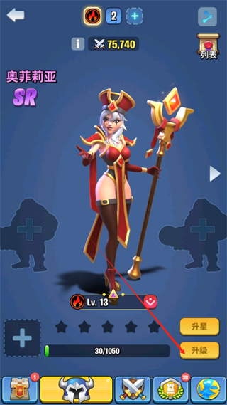 2、进入英雄界面,英雄是非常强力的角色,比士兵的输出能力大好几倍,所以培养英雄们是非常重要的,点击升级;