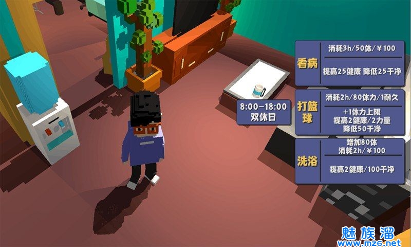做游戏强调一下健康。去药店买维生素,健康值一下降就疯狂嗑药,千万不要降到75以下,看病超贵的!干净50以下就洗澡,洗澡很好的,加健康值和灵感。