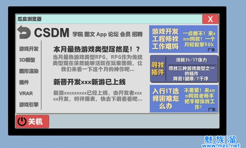 刷满室友好感度,体力提高到150,第一阶段任务完成。第二阶段重点是提升自己能力,期间抽空找插件,b以上(s极插件在游戏厅弄,但是……你试一下就知道有多难获得了,反正我试了两下就放弃了,a极就够了)四项能力不升到一两百不要做游戏。且做游戏就做原创,当评分接近一万的时候才能卖的出去。我做的第一个抄袭游戏卖一块钱都没人要,最后50卖给了游戏商,血亏(งᵒ̌皿ᵒ̌)。然后定价不要太高,我三万分的游戏才卖十块钱。这是我做的所有游戏↓(名字脸滚键盘起的)