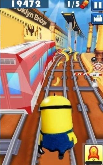 1、在小黄人奔跑的时候可以控制方向,尽可能的躲避前面的障碍和货车;