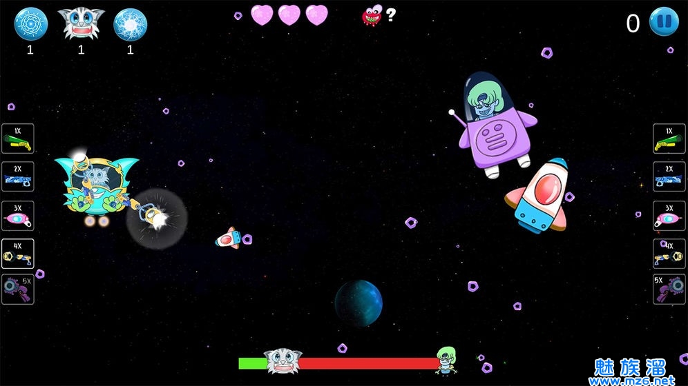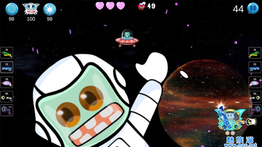 2、深入宇宙,向敌人发射子弹!挑战各种强大的邪恶怪物,击败它们来拯救银河,获得赏金。