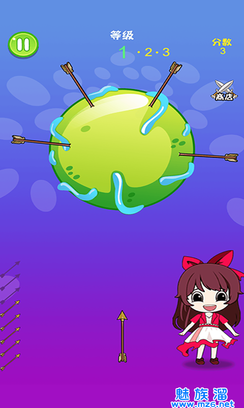1、灵活的控制飞箭,将飞箭成功的射中水果,操作简单但是通关并不容易。