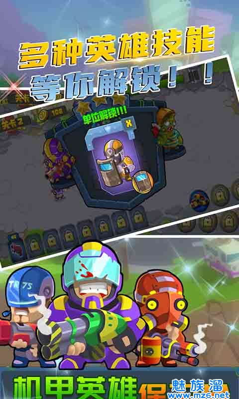 机甲英雄保卫战是一款射击策略类游戏。玩家会根据游戏关卡不同的难度进行通关,关卡关数越高难度越大。玩家需要在合适的时机进行操作,使用英雄击杀所有僵尸即为通关成功。除了需要快速有效地把僵尸阻挡在入侵的道路上。后续关卡需要一定的策略每种僵尸都有不同的特点,玩家可以针对不同僵尸的弱点来合理放置英雄,这也是胜利的诀窍。游戏画面精致,游戏关卡精心制作,给玩家带来更好体验。