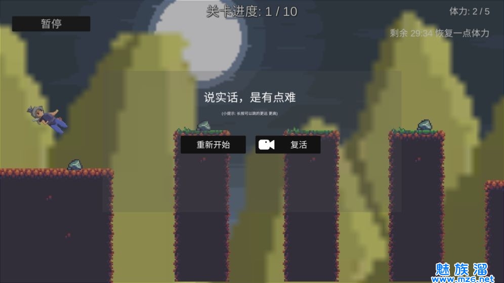 4、游戏设置五格体力,在一次次冒险跳跃中学会很难的中国功夫,游戏非常有趣。