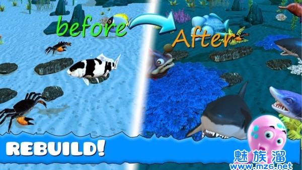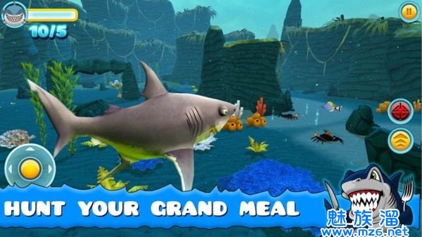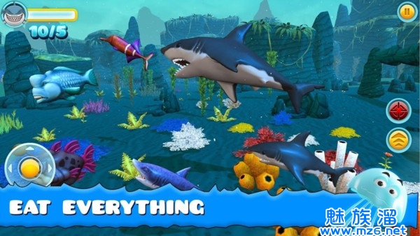 1、操控你的鲨鱼疯狂的捕食,每天都能和鲨鱼一样尽情的生活在海洋中;