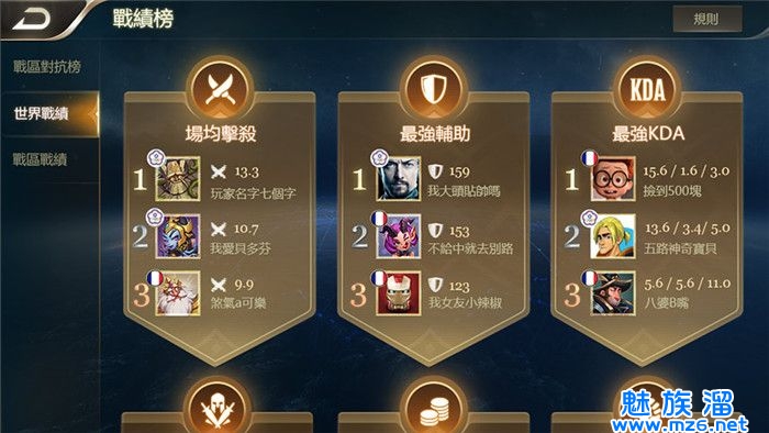 世界荣誉榜:在这边可以看到在最强输出、最强KDA、场均击杀最高等等单项数据上的世界排名,所有战区的挑战者将一起排名。