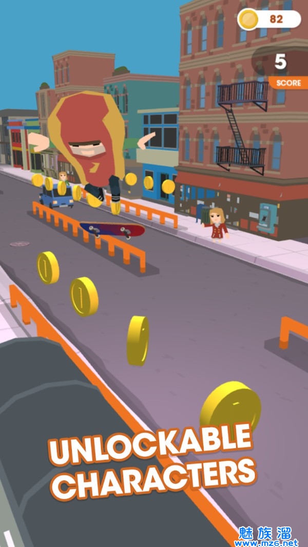 滑板街霸是一款简单的滑板竞技类游戏,玩家在游戏中将会在各种不同特色的赛道上进行自己的酷炫滑板表演赛,玩家要在各种障碍物的赛道上超过各种自己同行的对手,拿到的赛道上的散步的金币,为自己解锁更多的滑板样式以及自己的服装也可以进行换装哦,快来下载滑板街霸吧!