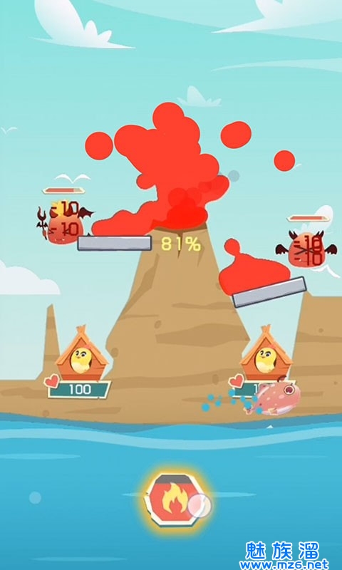 2、现在你需要操作火山喷发来消灭这些换单,敌人的生命条会有显示。