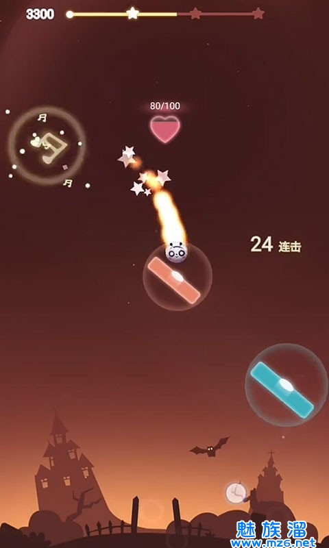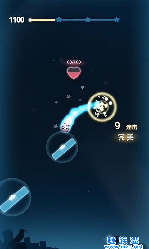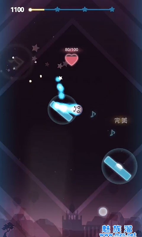 3、玩家只需在小球撞上横板的时点击屏幕任意位置,就可以点爆它,演奏出美妙的音符,使小球反弹而出继续下落,直到音乐结束即为过关。