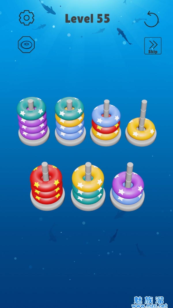 1、将相同颜色的圆环堆叠在一起,游戏内有众多这样的关卡等你来挑战;