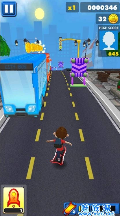 2、运行以获取更多硬币,兴奋地滑向安全,购买飞翔器滑板,前胸箱;