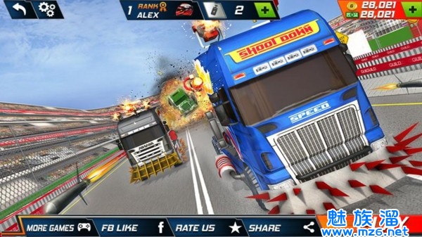 1、玩家可以挑选不同对手在竞技场中战开对战,使用车辆撞击敌人当耐久归零的时候车辆将会爆炸。