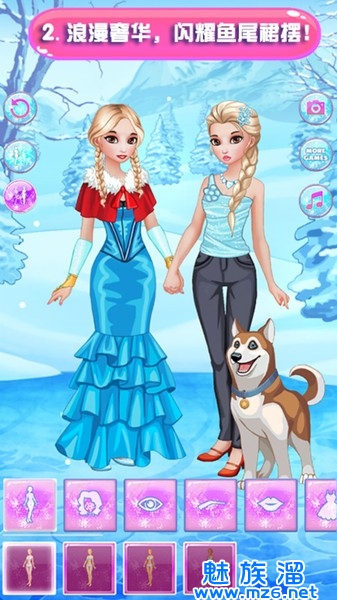 1、华丽魔法裙,蓬松蛋糕裙,闪亮鱼尾裙……快来帮冰雪公主换装,各种各样时尚美丽的裙子等着你来为冰雪公主打扮。