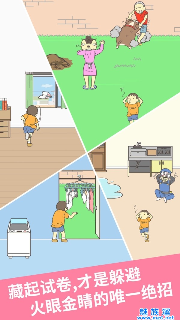 游戏中的玩家是一位正在上学阶段的学生而且不仅面临着早起床上学的难处而且还有很多科目的卷子需要完成,放学到家第一时间就是在妈妈的强迫下做试卷而且做的每一道题都不能出错所以要摆脱做试卷的烦恼将试卷藏起来。这款游戏中可爱调皮的孩子将和自己的父母玩起捉迷藏的游戏,因为自己考试得了零蛋,不想被自己的父母揍,就将自己考试得了0分的考试卷全部隐藏起来,我们要做就是不要被他的父母找到试卷。