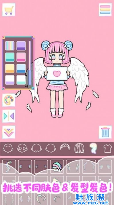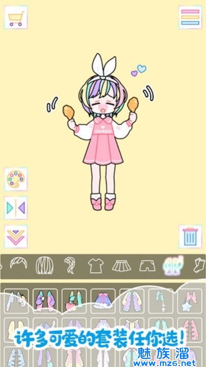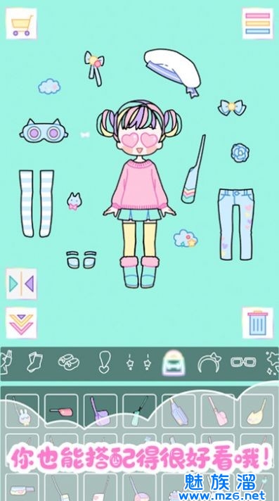 1、它是柔和的女孩自由换装的扮演游戏,以柔和的色彩和背景装饰可爱的女孩;