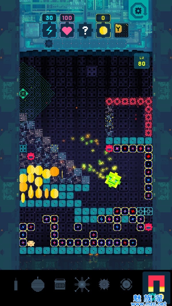 1、战略性地使用8种不同类型的炸弹,以清除道路并避免被上升的障碍物淹没。