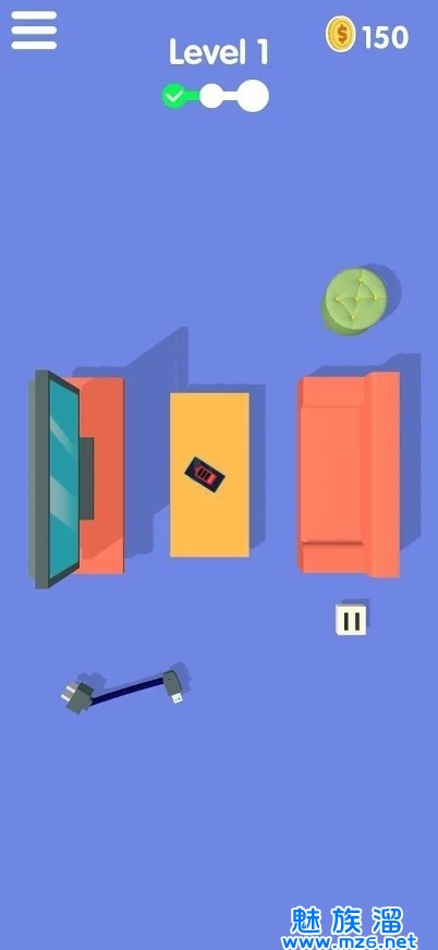 1.仔细观察场景,利用给出的道具来找到插座和充电线,让整个充电过程顺利进行。