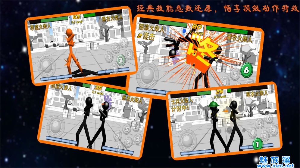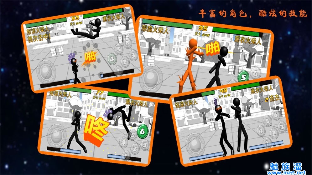 1、在不同的场景开始格斗,点击虚拟按键即可控制火柴人使用招式技能。