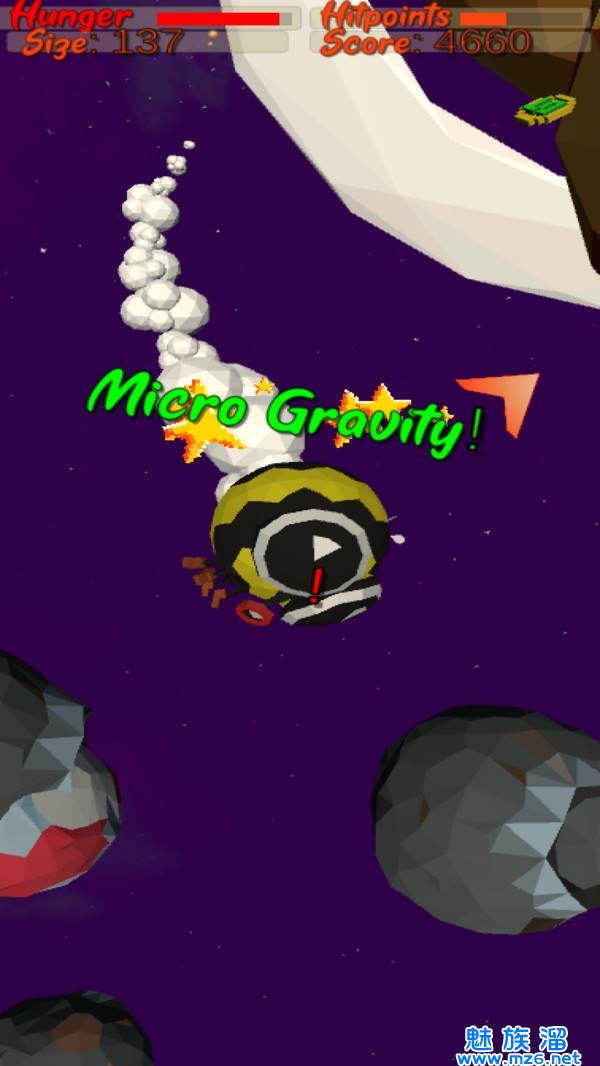 2、在太空中旋转时收集金币,花金币购买升级产品并提高星球的毁灭能力,取得高分。