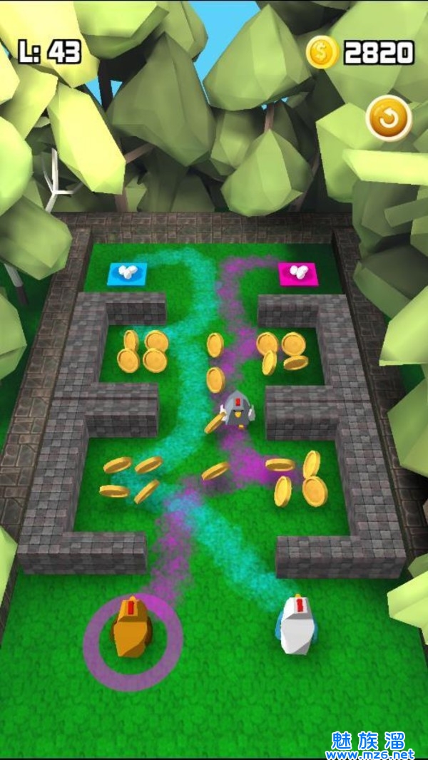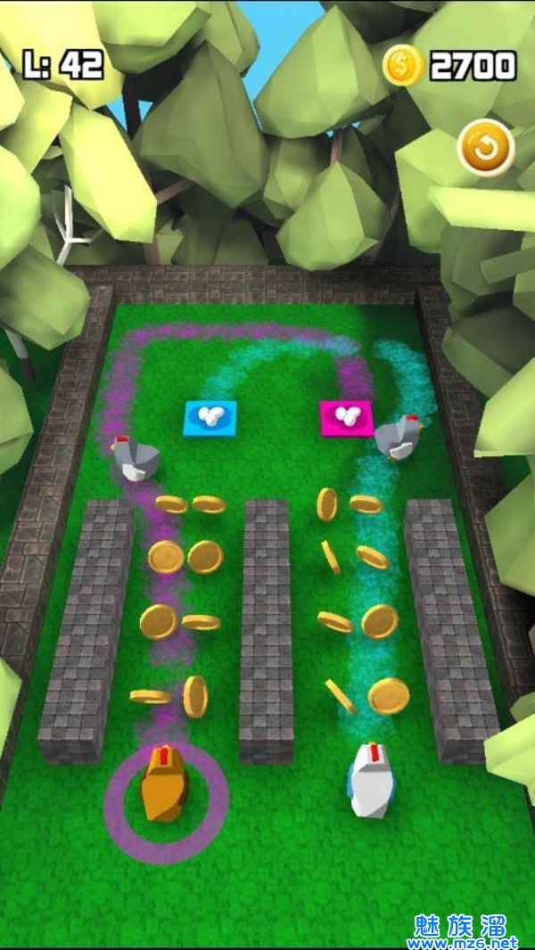 3、画一条路,让他们走。避开障碍物并互相撞击。用硬币购买帽子,以升级主鸡。