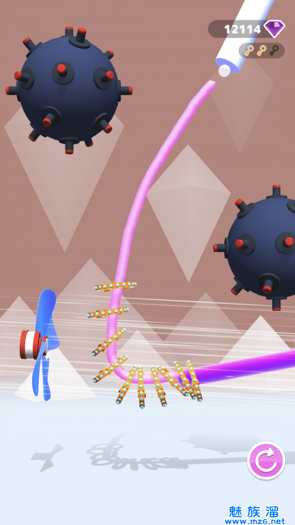 2.如果曲线转弯太大,则游戏在下降过程中很容易失败。动画3D场景,新级别显示了地雷,触摸时会爆炸;