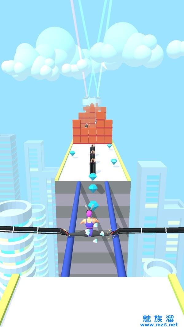3、点击控制角色移动,躲避障碍物收集鞋跟增加角色的高度,朝着终点移动,小心不要从道路上掉下去。