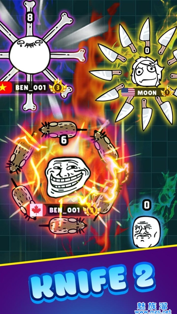 王尼玛大乱斗游戏。一款非常好玩的趣味闯关游戏,自由舒适经典好玩法的游戏模式,可以让玩家感受多人竞技带来的乐趣,在游戏中收集飞刀,让自己的飞刀数量变得更多,飞刀数量越多你就越强,战力不动会出现防守状态,但是只要飞刀多防守也没用,赶快加入游戏尽情体验吧!