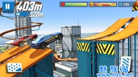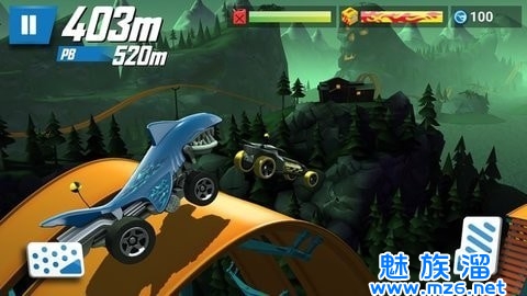 1、这款游戏与普通的竞速游戏的玩法不一样。摆脱以往的大地图游戏。这款游戏。变成了横版竞速,用了斜下30度俯视视角去看我们的赛车在飞驰中的运动状态。真的让我眼前一亮。并且游戏中是没有方向键控制的。我们只有一个刹车和油门,我们的油门可以让我们的车子加速。另外也可会让我们的车子前端翘起来。所以在游戏中,我们一直按着油门是一个不可取的方案。另外还有一个刹车是使我们的后轮翘起来,并且减慢我们的速度。