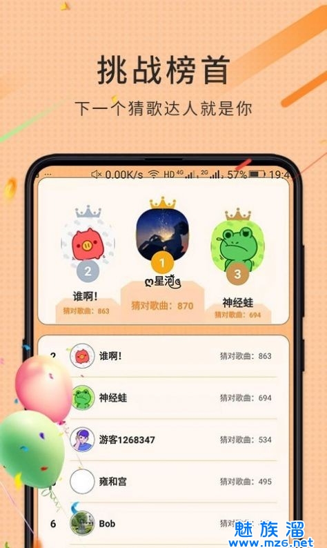 人人爱猜歌游戏。这是一款下载量非常大的益智类猜歌小游戏。好玩幽默开发大脑,游戏通过系统最先开始播放音量,初级关卡的倒计时很长,慢慢通关之后会获得大量的金币来提升自己的排名,同时还会获得复活卡。内存音乐达上千首,好玩不烧机,赶快来试试吧!!
