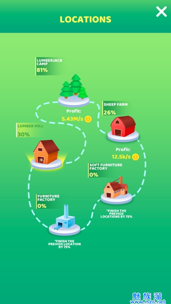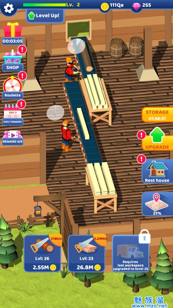 2.砍树能够取得更多金币,金币能够用来晋级你的员工,进步他们的砍树效率。
