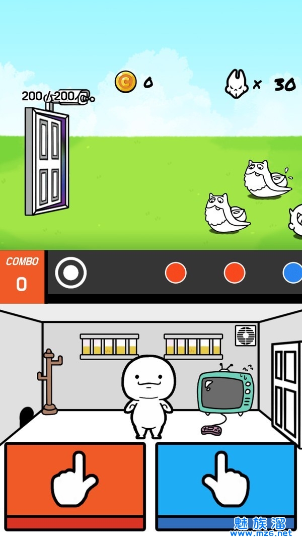 1、趣味的音乐节奏挑战开始啦!玩家需要快速反应点击红蓝按钮,将所有的蜗牛给击杀;
