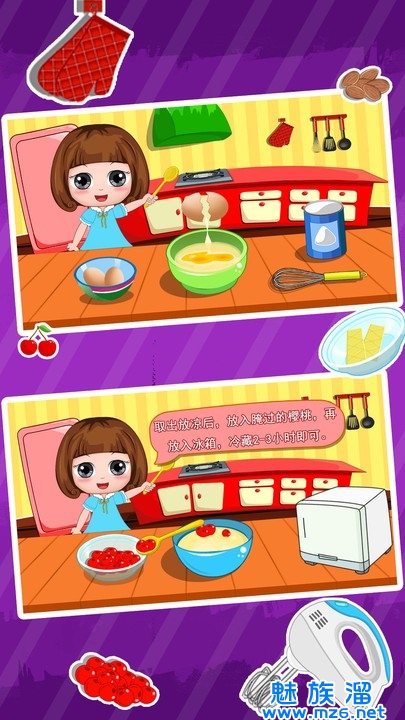 2、超多食材鸡蛋、牛奶、白糖、面粉、黄油、清水、樱桃等供喜欢儿童厨房的孩子们选择;