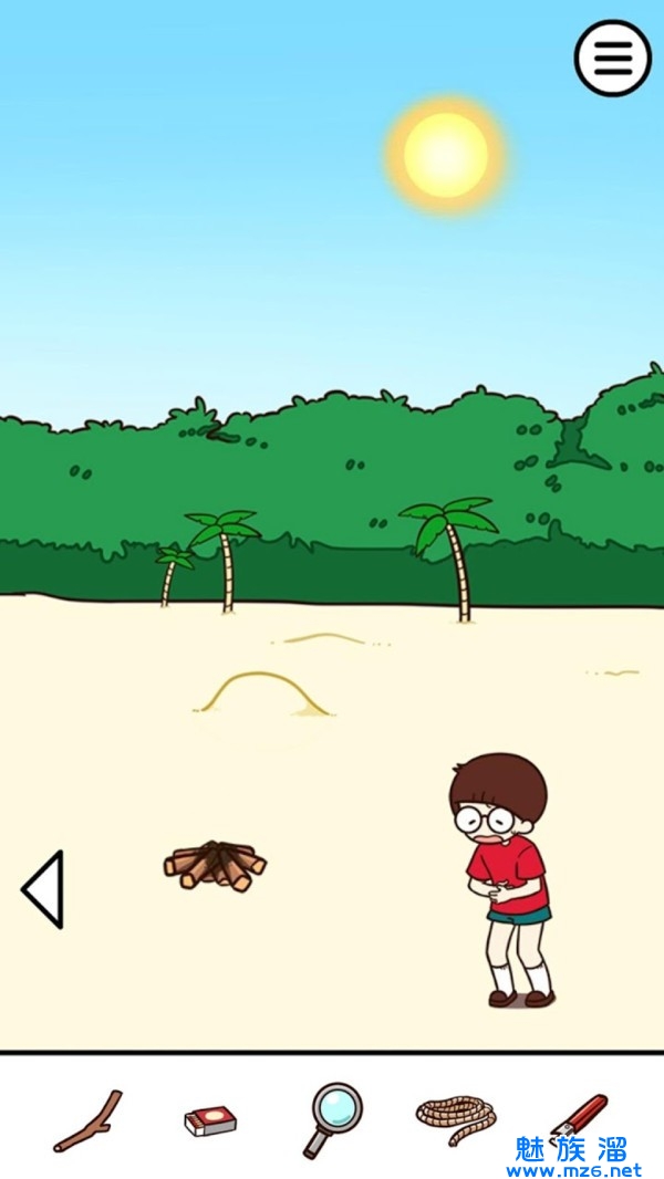 3、小男孩的肚子饿扁扁的快要不行了,利用给出的工具在场景内寻找食物、生火做饭吧!