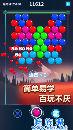 3个或3个以上相同颜色的泡泡连在一起会消失,越多的消除得分越高。