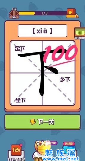游戏中会给出不同的文字,而玩家需要在这个文字的基础上添加一笔让这个字变成一个新的字;