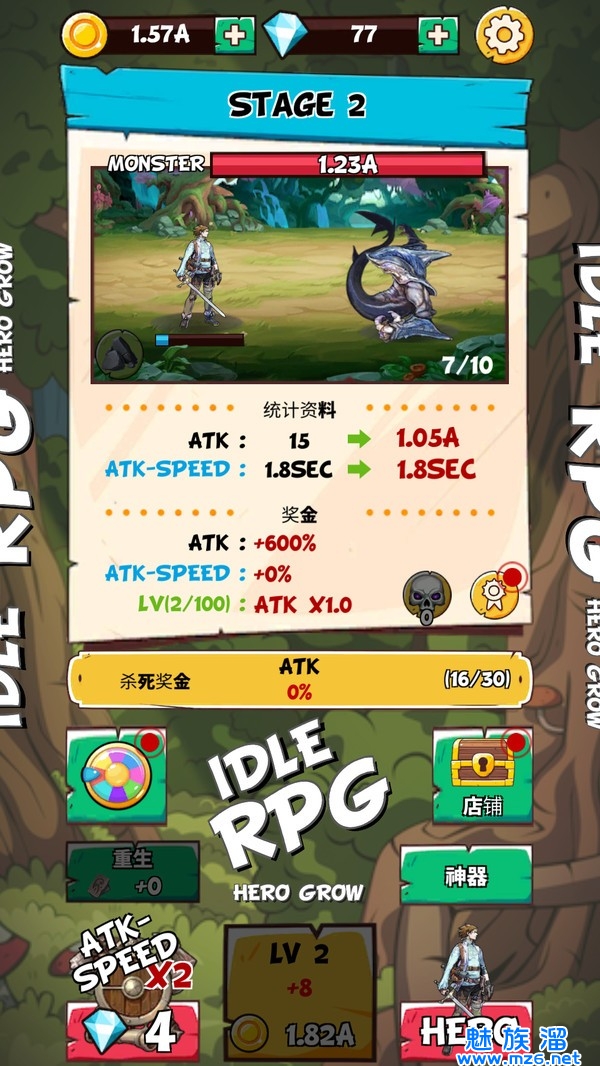 3、采用放置挂机的玩法,玩家不需要操作角色,它们会自动战斗,你需要做的就是升级,让他们拥有更强的能力。
