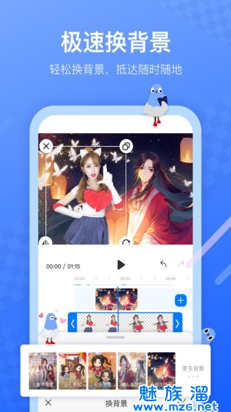 「换背景」背景库预置动漫、旅游地点等上百款炫酷背景素材,一键更换视频的人物背景,效果炸裂的视频极速制作!