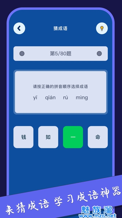提供各种成语的猜谜题目,通过选择正确的答案来解答。