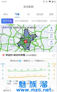 通过地图查看武汉地区实时实况数据和24小时实况历史数据,查看雷达回波图