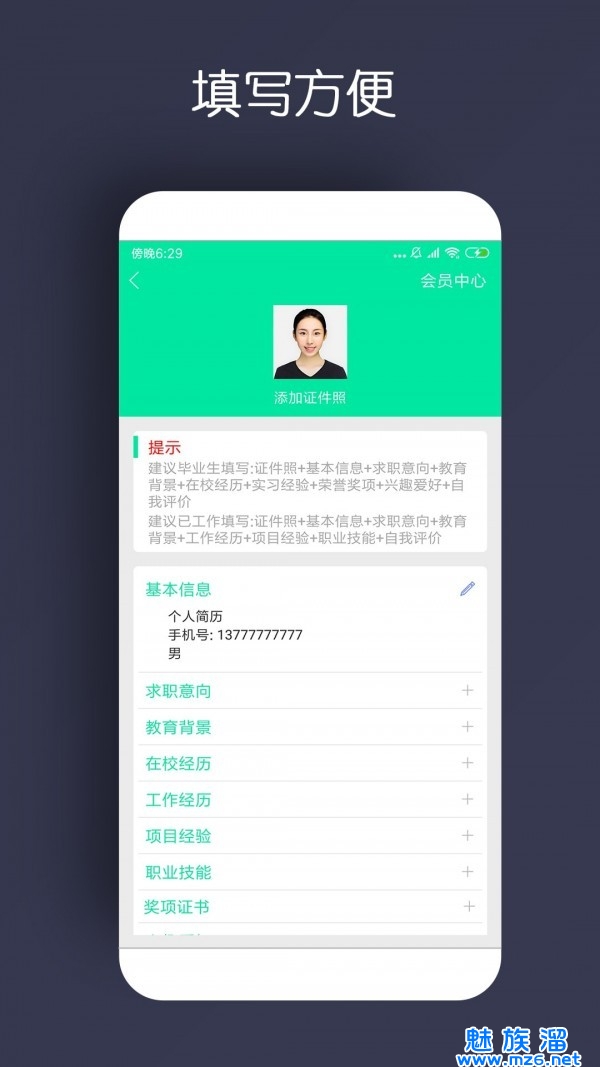 1.简洁易用的用户界面,帮你高效制作您的电子简历。