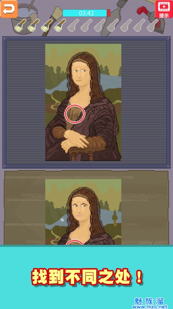 ・对比上下的美术品,点击不同之处进行修复。