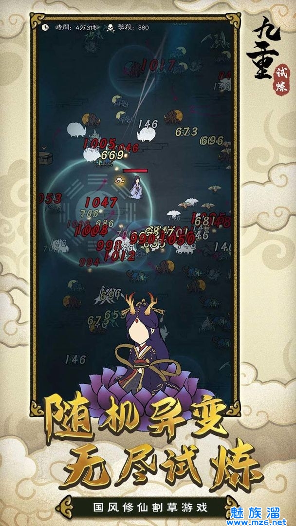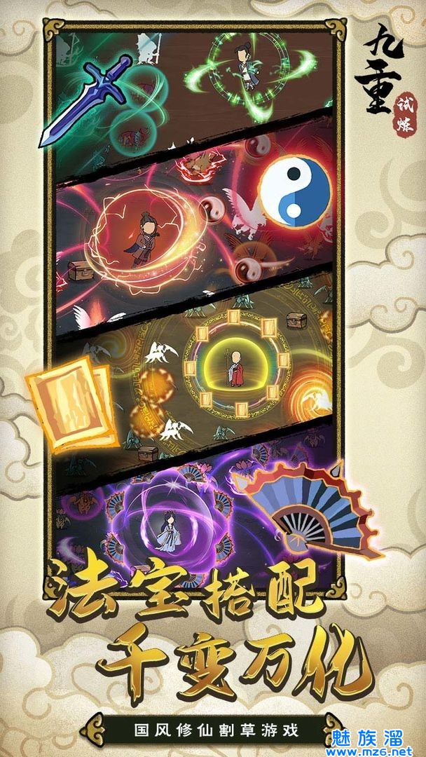 《九重试炼》是一款休闲畅快的国风割草游戏。通过灵活走位在怪潮横生的秘境中突出重围。怪潮太多?别担心!快使用你随身携带的传承法宝,随着战斗它会逐渐吸收灵魂变强甚至进化为上古神器,助你走出这九重秘境,成就仙人之躯!