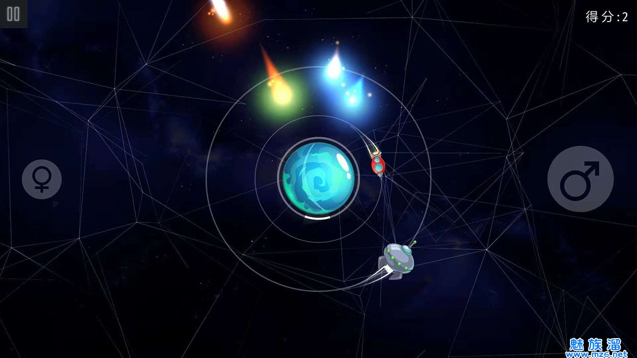 两个人在同一手机上,守护星球,双人模式,配合游戏,永久免费,在游戏中,玩家要做的就是操控自己的小球去撞击一切企图攻击你守护的星球的侵袭物体!