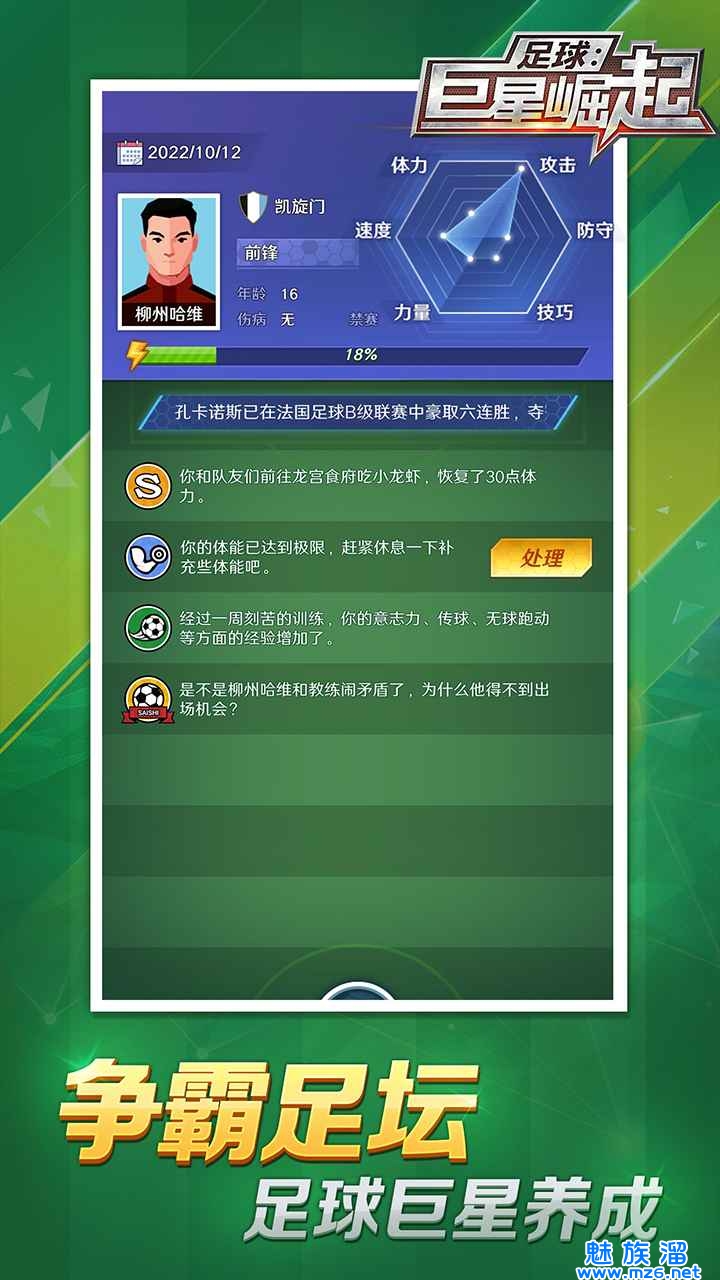 足球巨星崛起是一款模拟经营玩法的策略休闲类游戏,在这款游戏当中我们将定制自己的球员,安排各种球员进行他们不同的训练,并且试着去参与各种联赛,根据不同球员的不同的数据和状态,来安排他们不同的位置,并且在游戏中我们还可以真实的模拟每一场比赛,让玩家真实的体验经营一个足球队的乐趣所在,感兴趣的小伙伴快来下载吧!